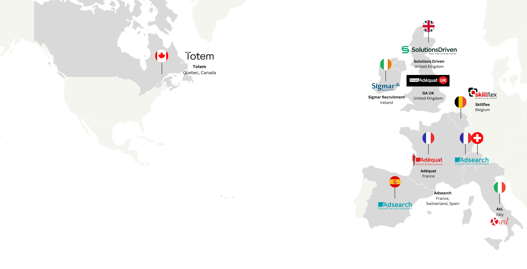 Our expertise is spread out through 8 strong and complementary brands (Adéquat, Adsearch, Sigmar Recruitment, Totem, Skillflex, AxL Group, Groupe Adéquat UK, Solutions Driven) in France, Belgium, Italy, Ireland, Switzerland, Spain, UK, and Canada.